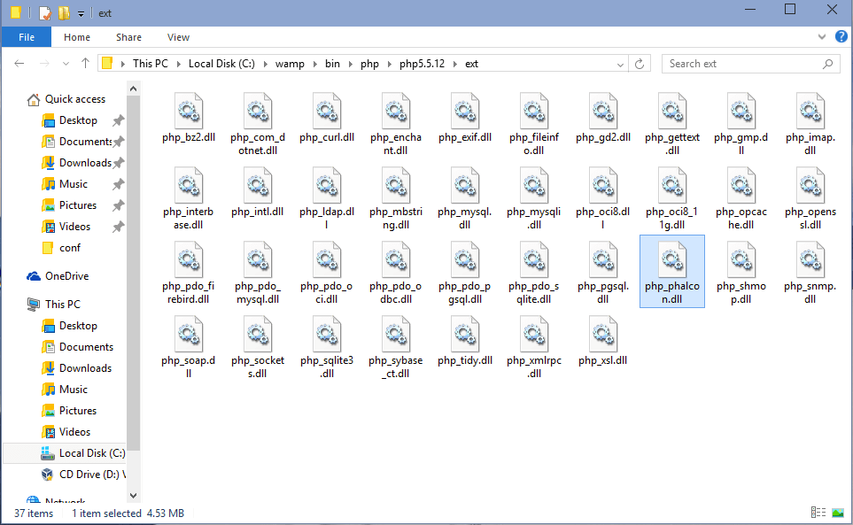 将php_phalcon.dll文件复制到PHP扩展文件夹中。 如果WAMP安装在C:\wamp文件下, 则扩展文件必须位于C:\wamp\bin\php\php5.5.12\ext (假设你的 WAMP 安装的是 PHP 5.5.12)。