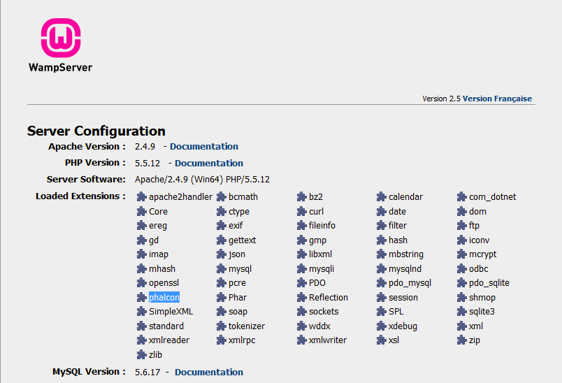 打开浏览器导航到 http://localhost。将出现WAMP欢迎页面。检查extensions loaded部分,确保phalcon被加载。